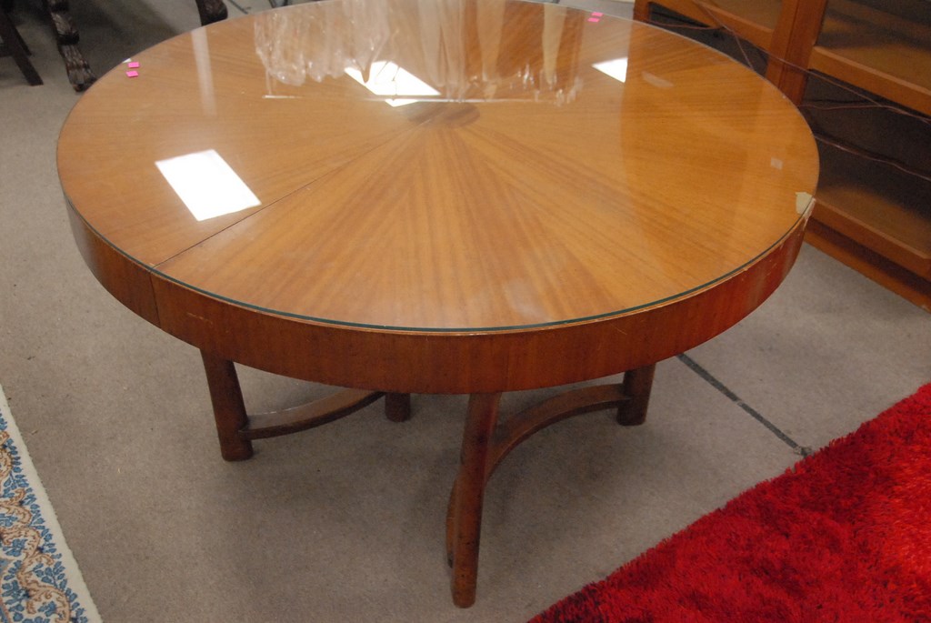 Robsjohn Gibbings dining table and sideboard by Widdecomb, circa 1952, table: dia. 48in.