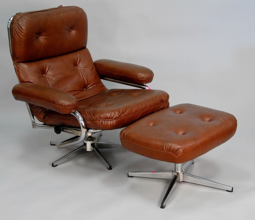 Chrome and vinyl upholstered English lounge chair and footstool along with a Mid-Century table lamp.