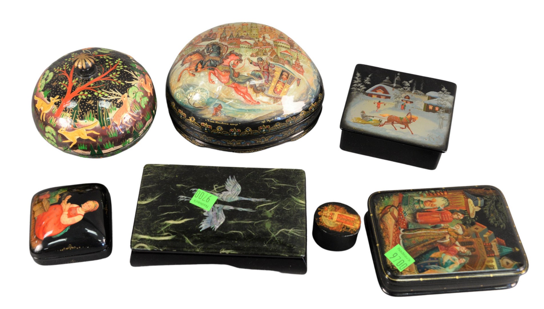 Group of Seven Russian Lacquer Boxes, to include a large molded oval box having three scenes, a large green box having two swans on the lid, along with five more boxes each having Russian scenes, largest height 3 inches, width 5 1/4 inches, length 6 1/2 inches. Provenance: Estate of James Wadhams