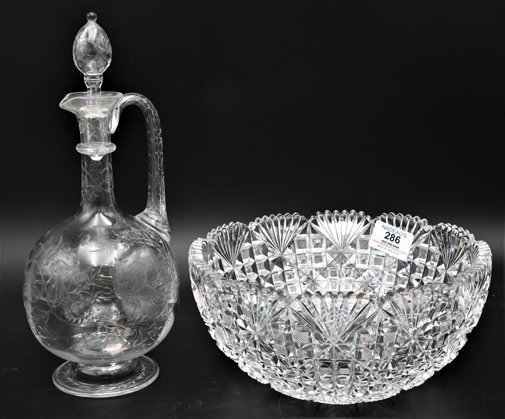 Two Glass Pieces, to include colorless cut glass bowl, height 4 1/8 inches, diameter 9 1/4 inches; along with an etched glass ewer having etched birds, height 11 1/2 inches, small chip on front of ewer.