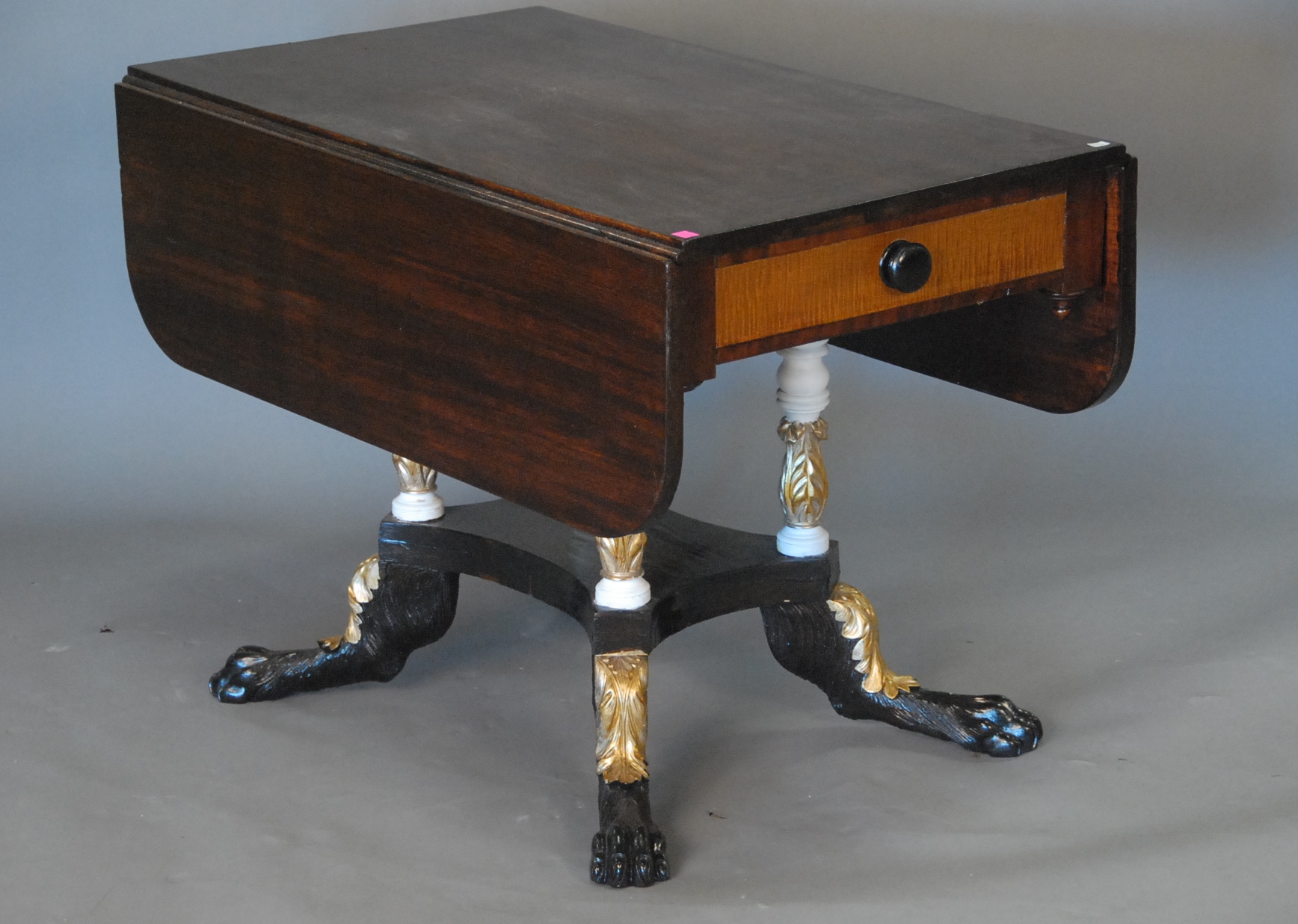 Lot 288: Federal mahogany drop leaf table with carved paw feet and tiger maple drawer front. ht. 27 in. lg. 28 in. wd. 21 1/2 in.