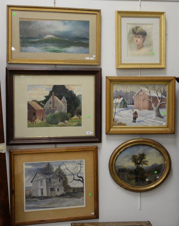 Six paintings including watercolor winter landscape signed lower right Sherwood Blodgett, a watercolor bust of boy 11 x 9, oval oil on board landscape 14 1/2 x 17 1/2, a watercolor landscape with white house signed indistinctly lower right 14 x 18, pastel of crashing waves signed Chandler 11 x 23, and Richard German watercolor winter scape with house signed lower right Richard German 82.