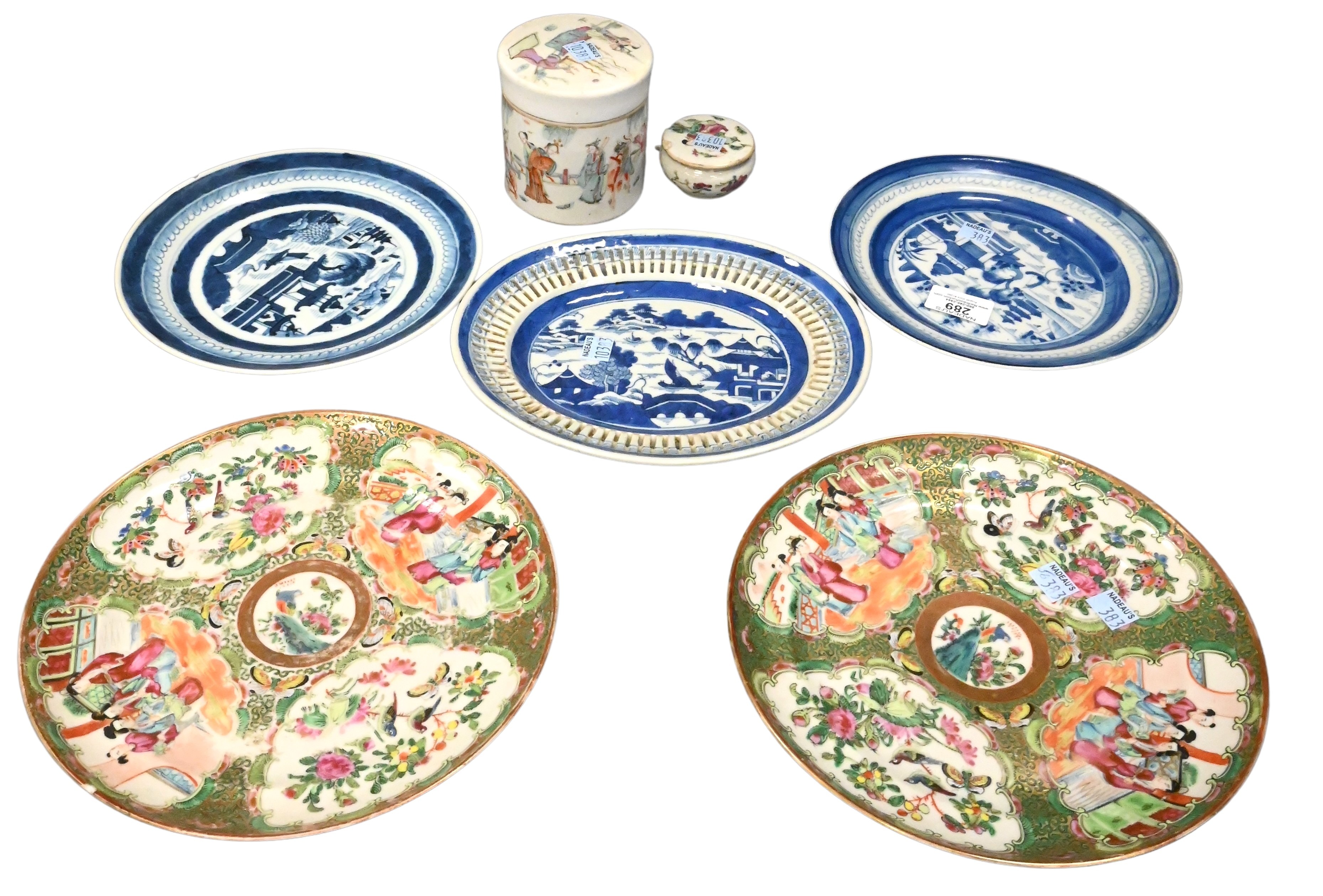 two red lacquered and gilt openwork carvings, three small cloisonne vases, large cloisonne plate, rose medallion export punch bowl, Chinese porcelain charger, large planter, Cambodian sandstone carving of a female figure, Japanese Meiji style crane and tortoise, birds and butterfly teapot and creamer etc…