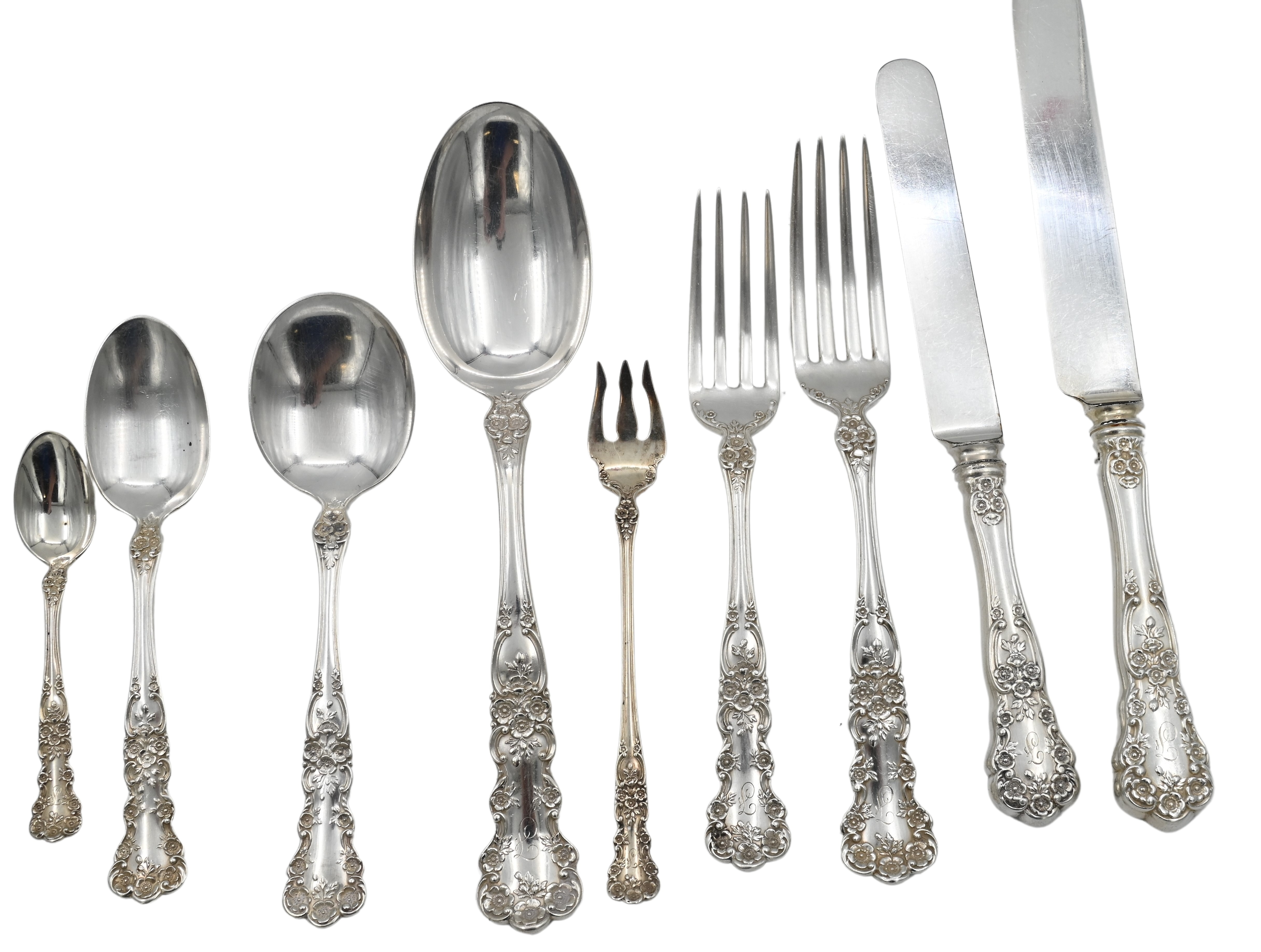 to include 12 dinner forks, 12 luncheon forks, 16 cocktail forks, 12 place spoons (one broken), 18 teaspoons, 12 soup spoons, nine demi spoons, 12 dinner knives, 12 luncheon knives, 18 butter knives, one ladle, one cake knife