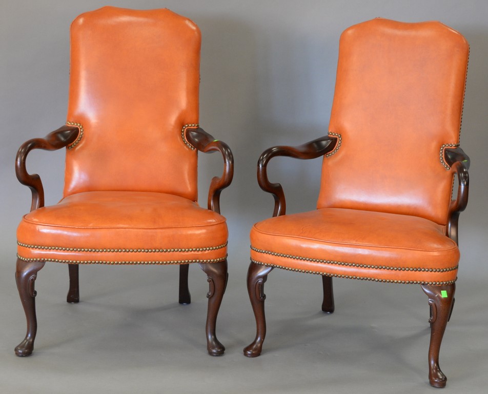Lot 297: Pair of Queen Anne armchairs with leather upholstery.
