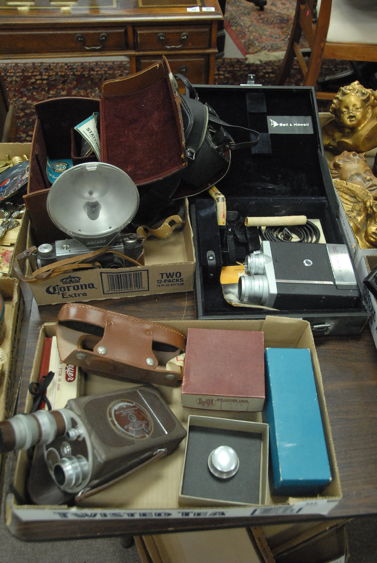 Four fishing reels and two tray lots of fishing gear to include nickel silver reel The Kosmic Reel, an Appleton and Bassett Boston reel, Hico-Matic automatic reel, and Shakespeare 1920 Wondereel, two vintage Old Pal worm boxes, South Bend spinners, hand tied salmon flies, three Bray leather fly holders, scales, wicker creel, etc.