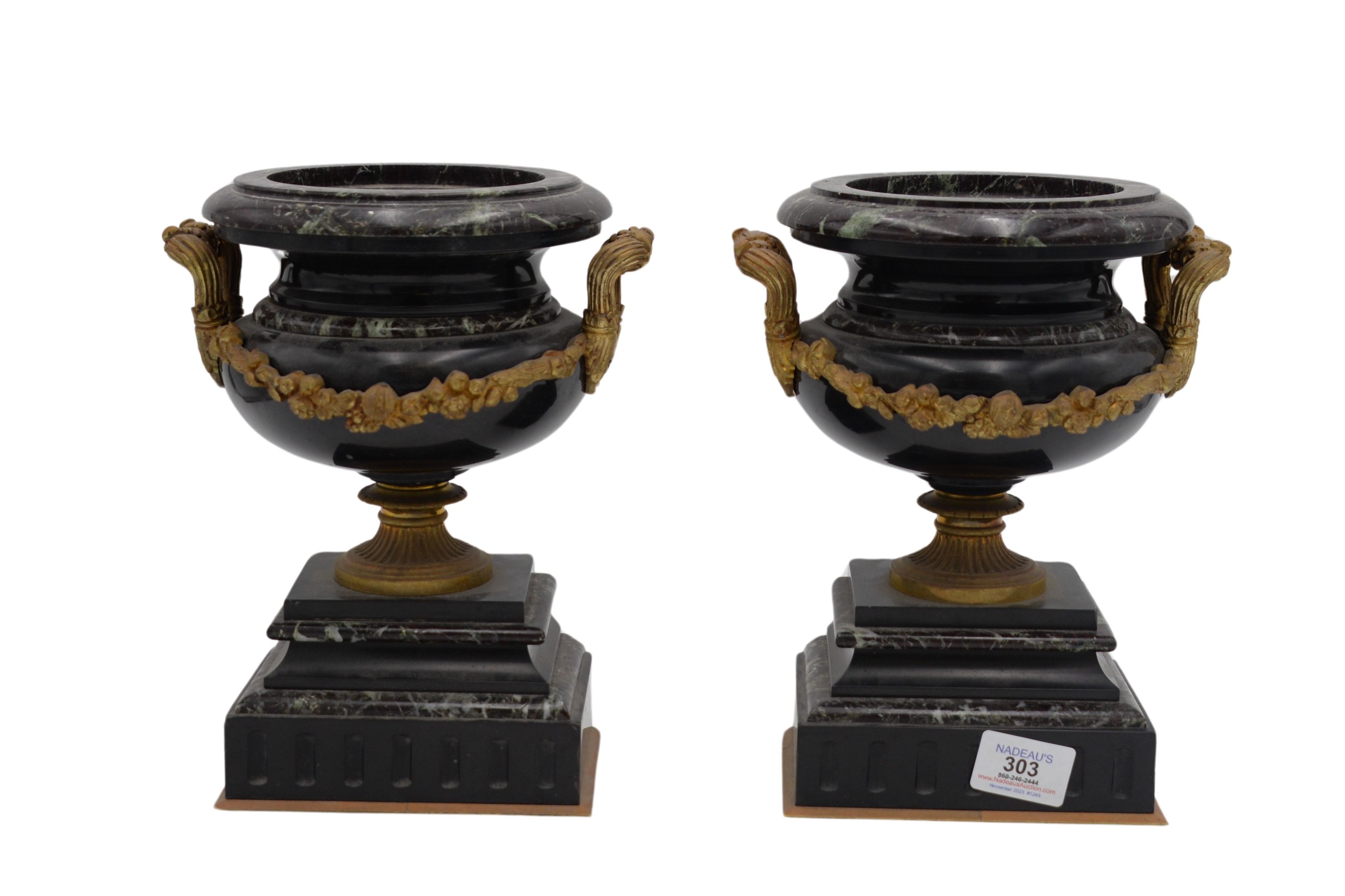 Pair Of Neoclassical Rouge Marble Tazza Urns, 19th century, made of slate and marble, with bronze mounted handles and floral wreath on pedestal base, height 9 1/2 inches