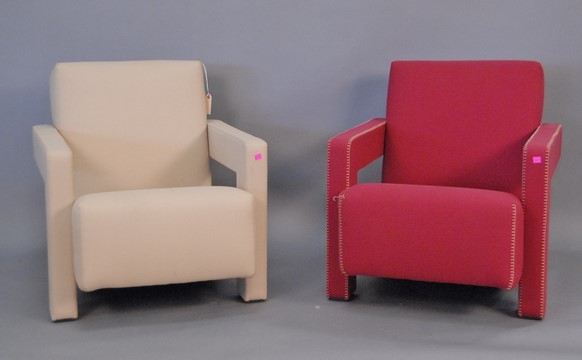 Lot 313: Pair of Gerrit Rietveld Utrech chairs by Cassina, Boucle fabric.