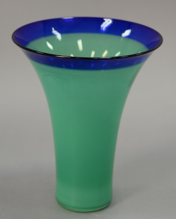 Lot 313: Philip Baldwin and Monica Guggisberg trumpet vase having celadon green body and cobalt blue rim. ht. 7 1/4in.