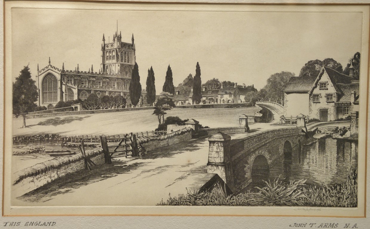 Three etchings by John Taylor Arms 1887-1953 including This England signed in pencil lower right: John Taylor Arms 1952, sight size 7 x 12 and a pair of etchings Third State Personal Collection A Basilica of the Madeleine, Vzelay and Collection A Cathedral de Saint Pierre et Saint Paul, both pencil signed lower right: John Taylor Arms. plate size: 7 x 2, 12 1/2 x 5 1/2, and 12 3/4 x 7 1/4 Provenance: Estate of Arthur C. Pinto, MD