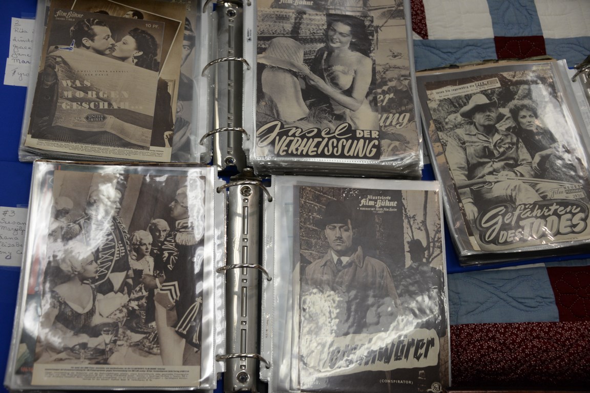 Three binders of Film-Buhne program brochures, some signed, of Susan Hayward, Marylyn Monroe, Lana Turner, Elizabeth Taylor, Tony Curtis, Rita Hayworth, Linda Darnell, Grace Kelly, Jane Russell, Tyrone Power, Esther Williams, Maureen O’Hara, and Yvonne De Carlo.