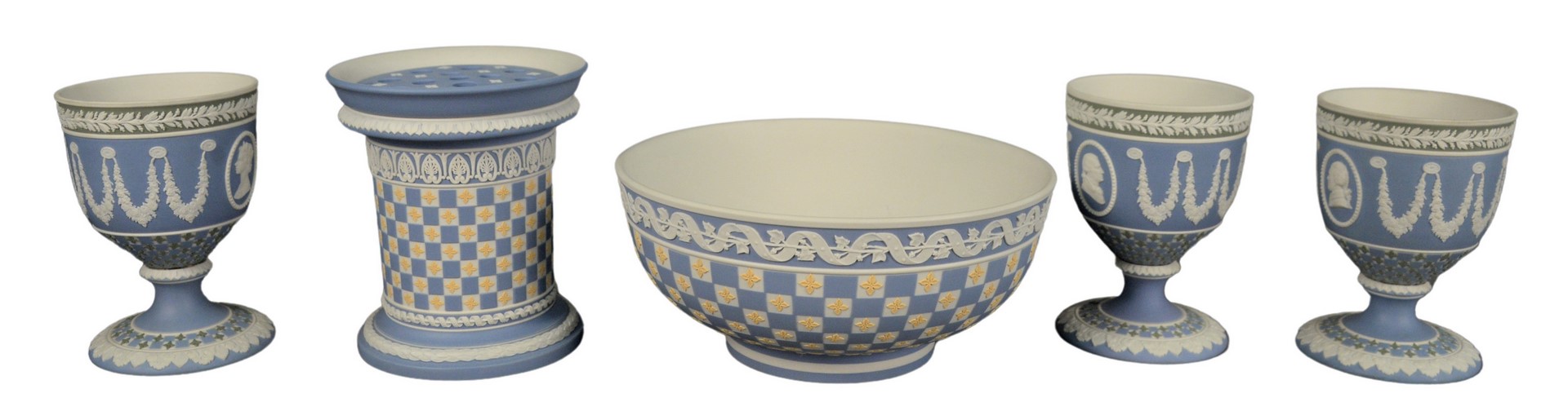 Five Piece Wedgwood Tri-Color Group, to include a vase with flower frog insert, bowl in blue, white, and yellow, along with three American Independence Bicentennial goblets in blue, white, and green, all dip diceware, diameter 8 inches. Provenance: Estate of James Wadhams