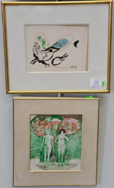 Four small framed items to include Marc Chagall, lithograph, Coq a’ la Palette, having Galerie Adrien Maeght label Andree Ruellan 1905-2006, mixed media, Landscape, signed in pencil lower right: Andree Ruellan Rosemarie Beck 1923-2003, Study: Nudes IX, signed lower left: R. Beck, Peridot Gallery Label on verso and Byron Leslie Burford 1920-2011, watercolor sketch, Rose, with Babcock Galleries label. sight sizes: 5 3/4 x 7 3/4 to 8 3/4 x 11 3/4
