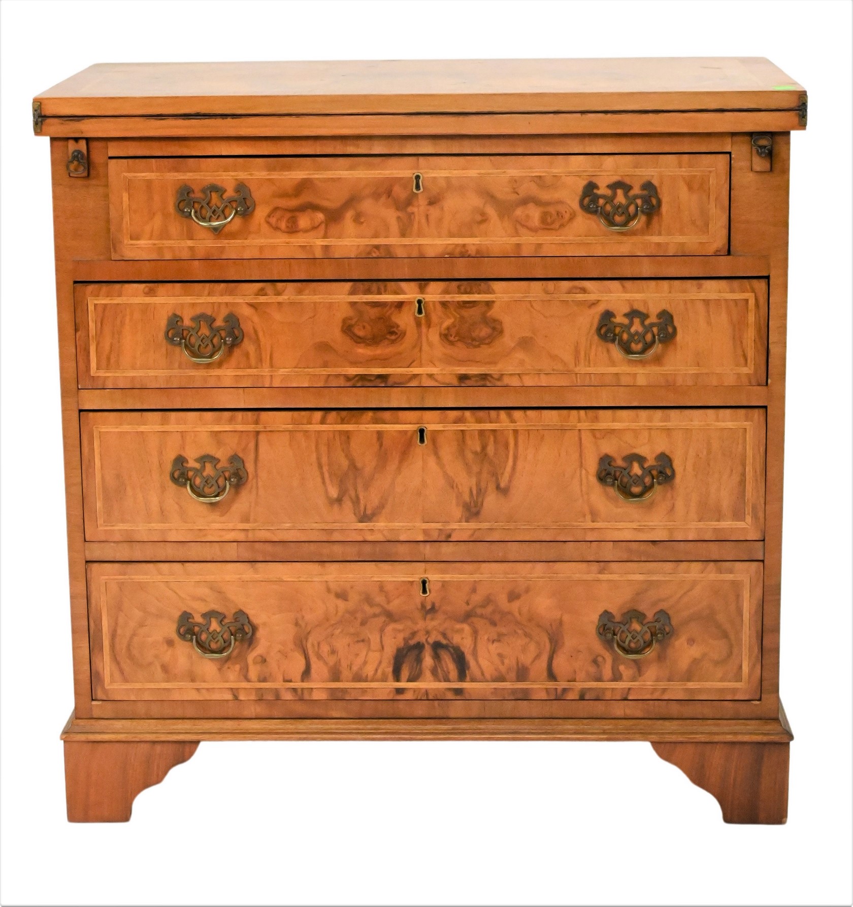 Custom Burlwood Bachelors Chest, with flip lid, over four drawers, height 28 1/2 inches, width 28 1/2 inches, top 13 1/2″ x 28 1/2″, Provenance: Julius H Jacobson II a Fifth Avenue Estate.
