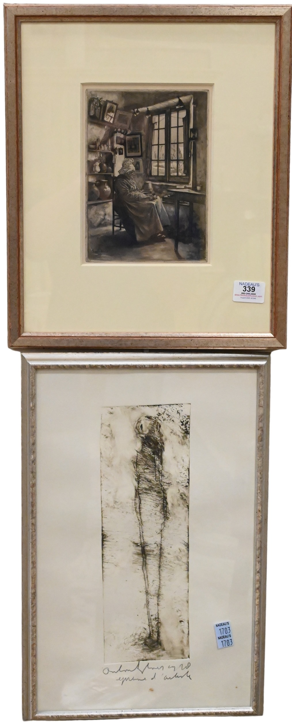 having etched and painted figures on it, signed near bottom of painted area and on the very bottom and dated 1895