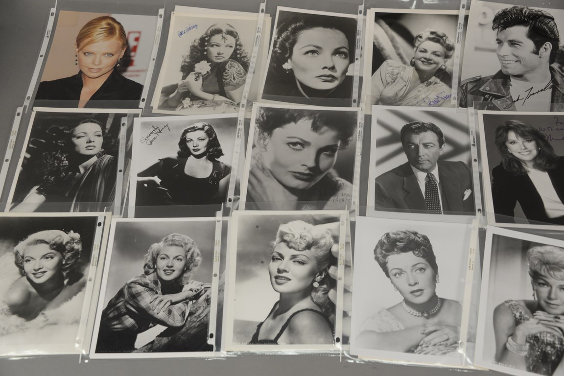 Group of 42 photographs, 16 are autographed photographs including 2 Gene Tierney, 1 Daniel Travanti, 2 Clair Trevor, 2 Ursela Thiess, 3 John Travolta, 1 Marlo Thomas, 1 Emma Thompson, 2 Uma Thurman, and 2 Lana Turner, and 26 unsigned photographs including 5 Gene Tierney, 1 Robert Taylor, and 20 Lana Turner.