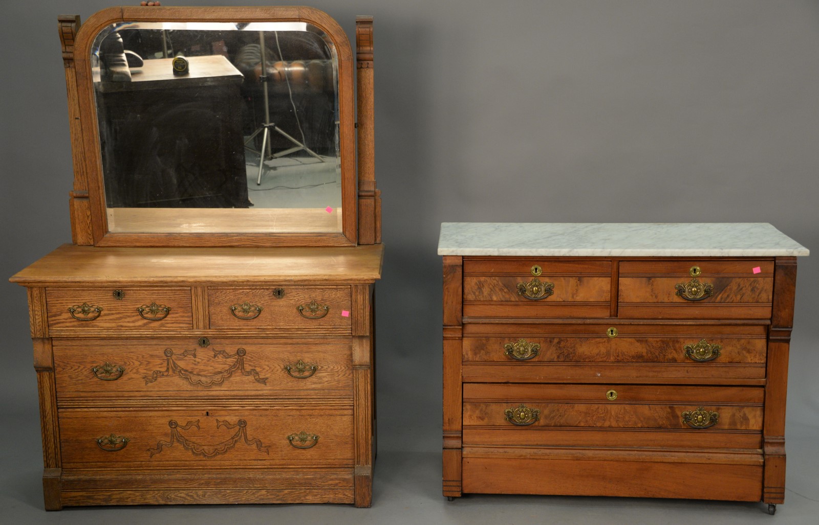 Two piece lot to include oak two over two drawer chest with mirror and walnut marble top two over two drawer chest. chest with mirror: ht. 59 1/2 in. wd. 44 in. dp. 20 in., chest with marble: ht. 33 in. wd. 41 1/2 in. dp. 17 1/2 in.