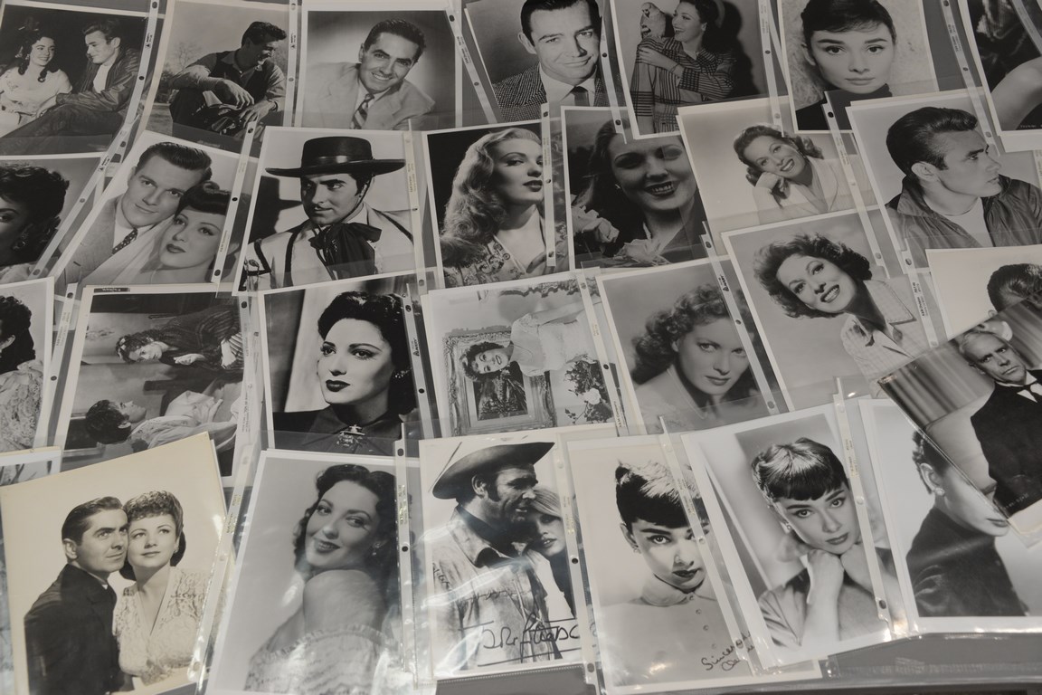 Group of 91 unsigned photographs including 6 Sean Connery, 7 Audrey Hepburn, 5 James Dean, 6 Rita Hayworth, 8 Yvonne De Carlo, 6 Susan Haywood, 8 Maureen O’Hara, 10 Linda Darrell, 10 Tyron Powers, 8 Linda Darnell, 10 Elizabeth Taylor, and 7 Rock Hudson.