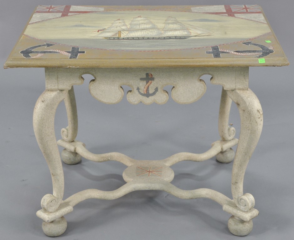 Lot 350: Decorative table painted with three masted ship. ht. 28in., top: 27 x 37