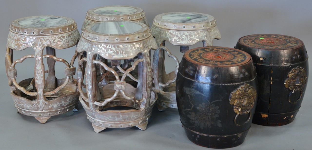 Three pairs of garden seats, two pairs with inset marble as is. ht. 20in.