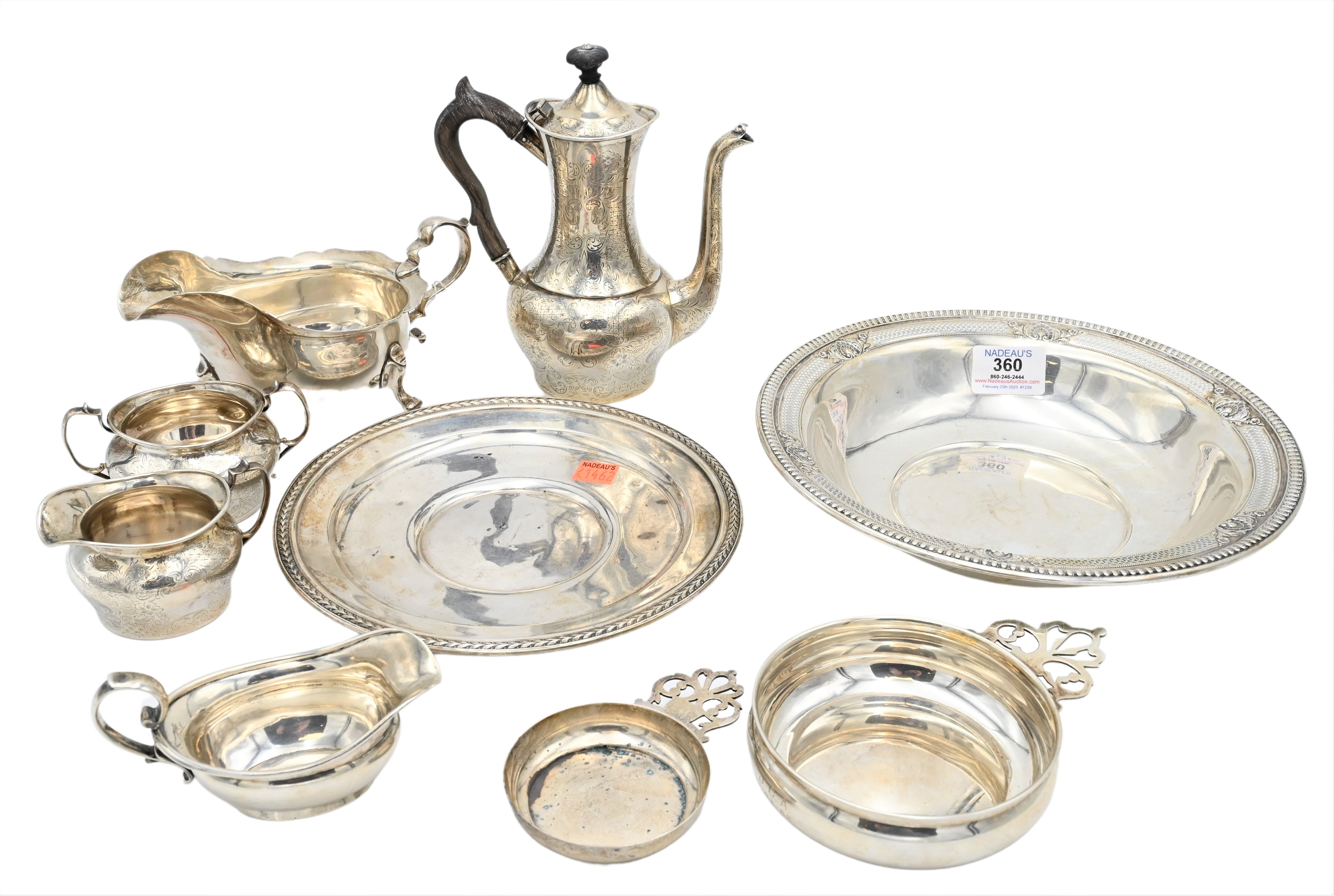 Nine Piece Sterling Silver Lot, to include a three piece tea set having teapot, sugar and creamer, a Tiffany & Company creamer, a Tiffany & Company porringer, a Towle porringer, Ensko gravy boat, along with a sterling bowl and plate, teapot height 7 inches, weighable 34.3 t.oz.