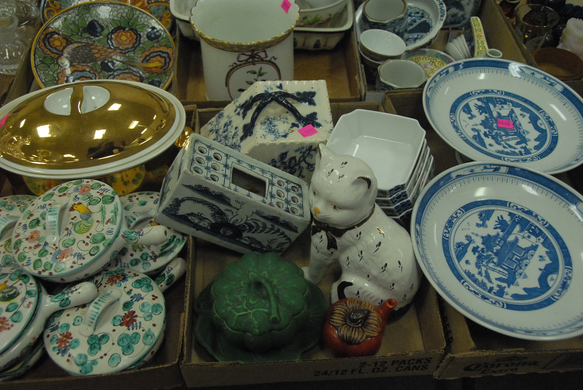 Four box lots to include two Holland enameled pots, Dansk serving dish, porcelain serving dish with duck cover, yelloware bowl and two lamps, Delft tiles, pair of white metal figures, etc.