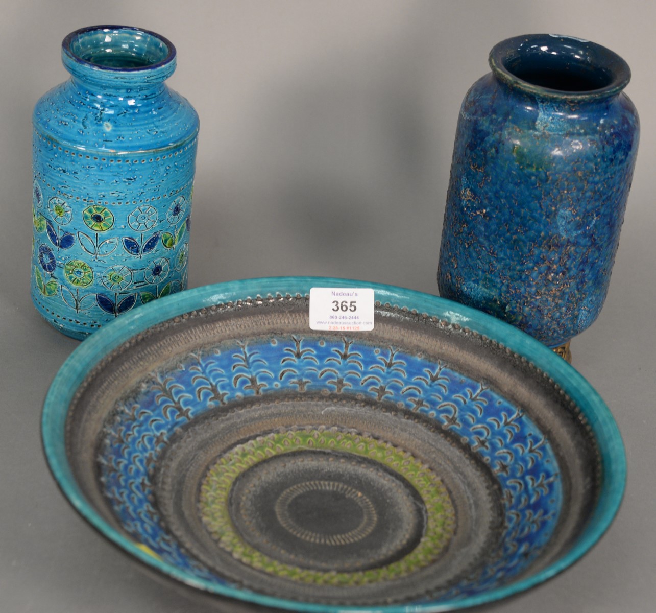 Lot 365: Three Italian blue glazed ceramic vases and a charger, possibly Londi or Bitossi.vases: ht. 8 in. and ht. 7 1/4 in., charger: dia…