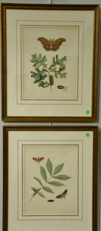 John Abbot 1751-1839 four hand colored aquatint engravings including Common White Spot Moth Phalaena Senatoria plate #57, Gall-Berry Hawk-Moth Sphinx Prini plate #35, Peacock Emperor Moth Phalaena Polyphemus plate #47, and Hickory Hawk-Moth-Sphinx Juglandis plate #29, published by James Edward Smith, sight size each: 14 1/4 x 11 Provenance: Property from Credit Suisse’s Americana Collection