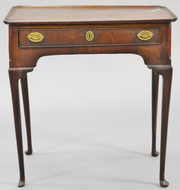 Lot 365: George II mahogany tea table having dished top and one drawer, circa 1750 half of one foot missing. ht. 29in., top: 16 x 28