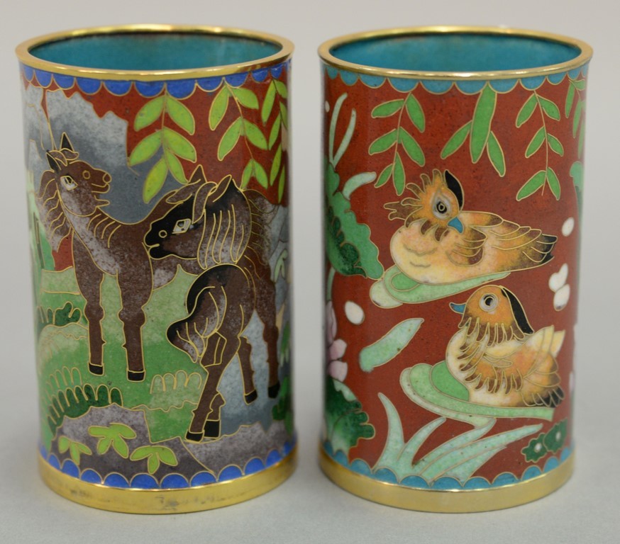 Lot 365: Set of thirty Chinese Cloisonne cups, chrysanthemum and birds, horses, deer, butterflies, fish, and ducks. ht. 4in.