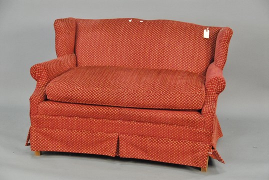 Tall case clock, mahogany and mahogany veneer having pediment top over tombstone dial with scalloped top door on plain base with bracket feet low, painted porcelain tombstone dial with brass works. ht. 82in.
