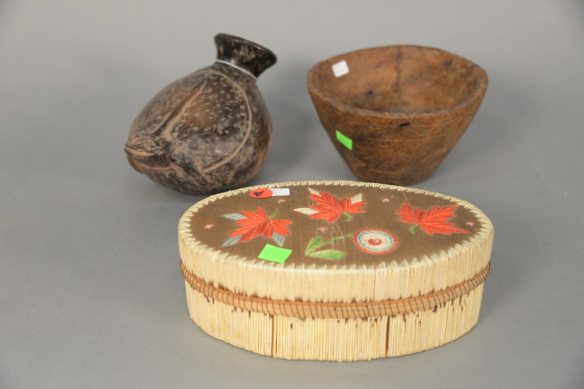 Three piece lot to include Woodlands Indian Burl bowl, bark quill decorated oval covered box, and Frog Effigy pot/bottle. bowl: ht. 4 in. dia. 7 1/2 in., box: 5 1/2 x 9 1/2 effigy pot: ht. 5 3/4 in. lg. 8 in.