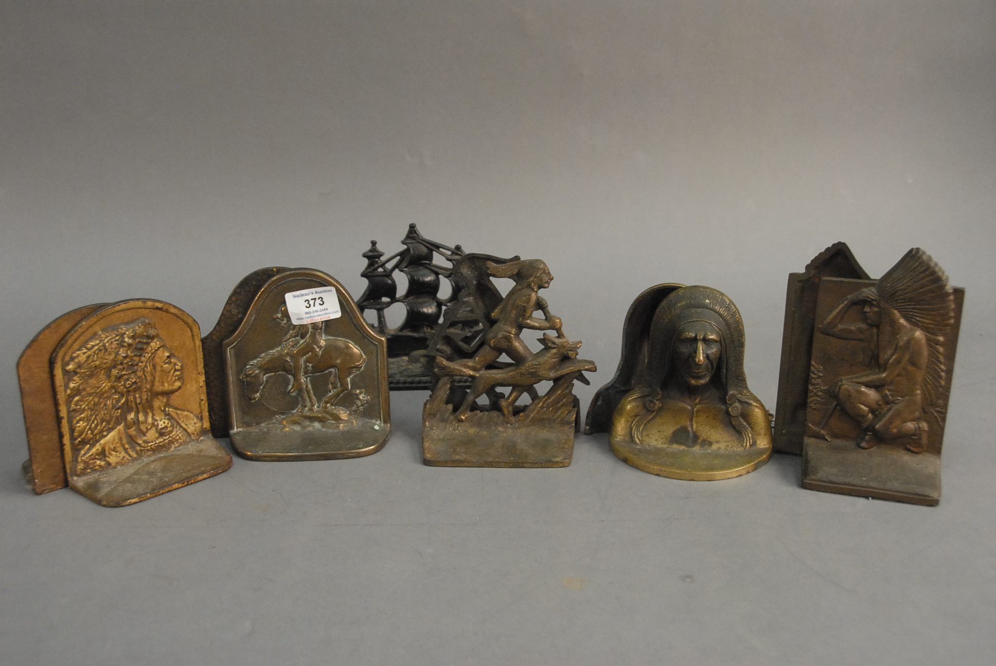 Lot 373: Five pairs of Indian book ends, Bronze and iron along with an iron ship.ht. 6 in. to 7 in.