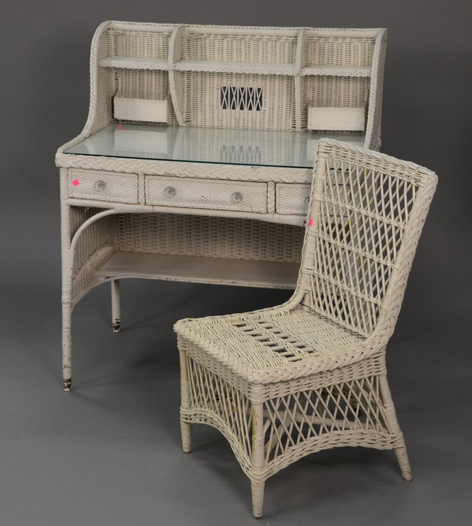 Lot 373: Wicker desk and chair. desk: ht. 43 in. wd. 36 in. dp. 23 in.