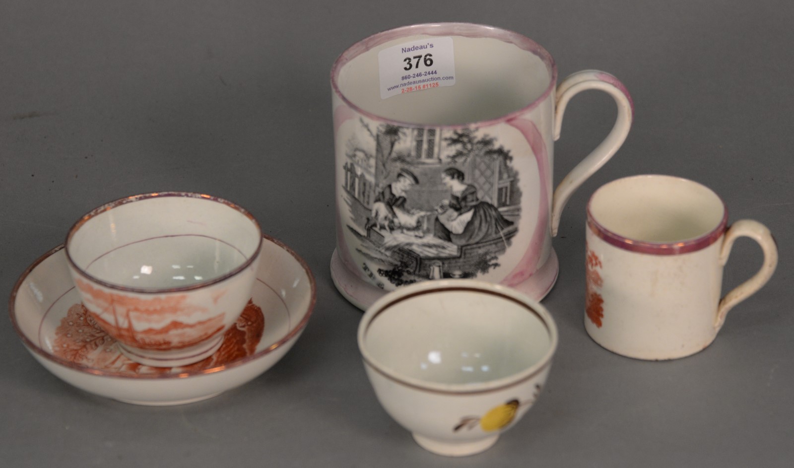 Five piece lot early Leeds cup and saucer with orange transfer with American ship, large cup plus two small cups. largest: ht. 4 in., smallest: 2 in.