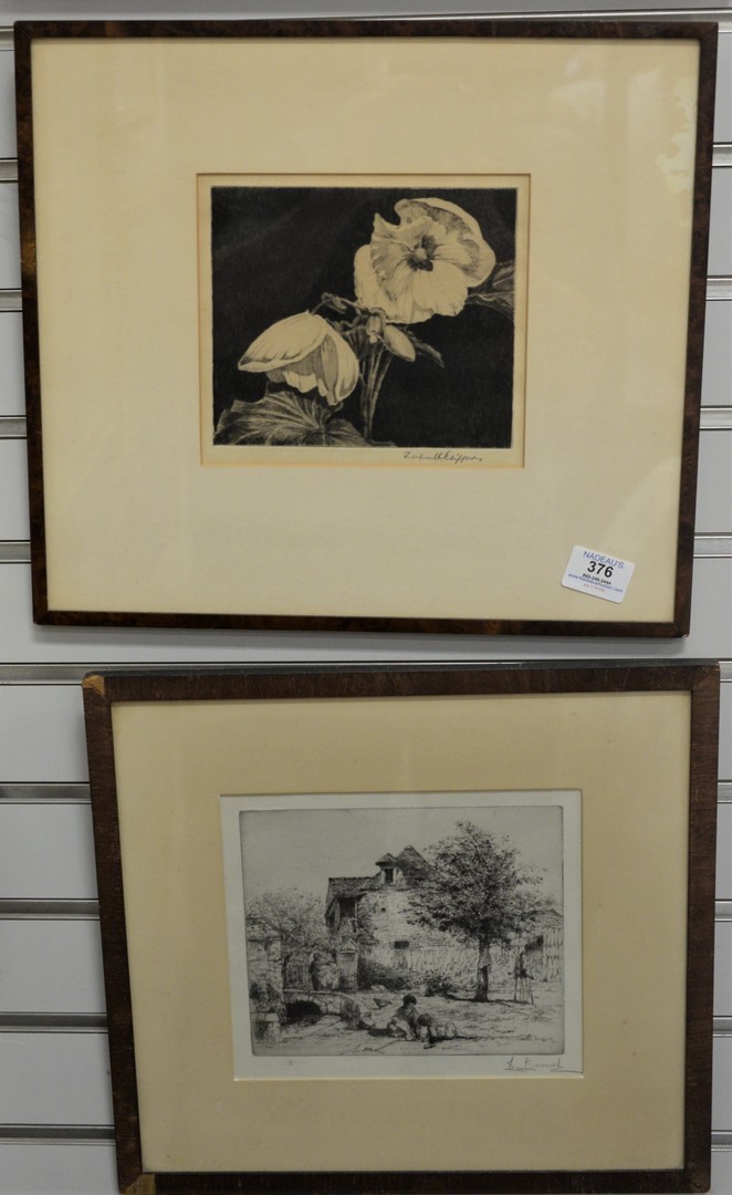Lot 376: Three Piece Lot, to include Golden Dawn by Walter Bohl, etching on paper, signed, titled and numbered in pencil in the lower margin; The Old Mill, etching on paper, signed in pencil indistinctly; along with a woodcut of flowers, signed indistinctly lower right, 7 1/2″ x 10″.