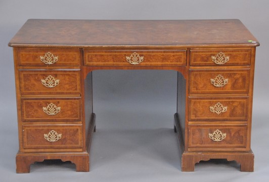 Lot 389: Baker kneehole desk with burlwood top and drawer fronts. ht. 30 in. top: 28 x 54