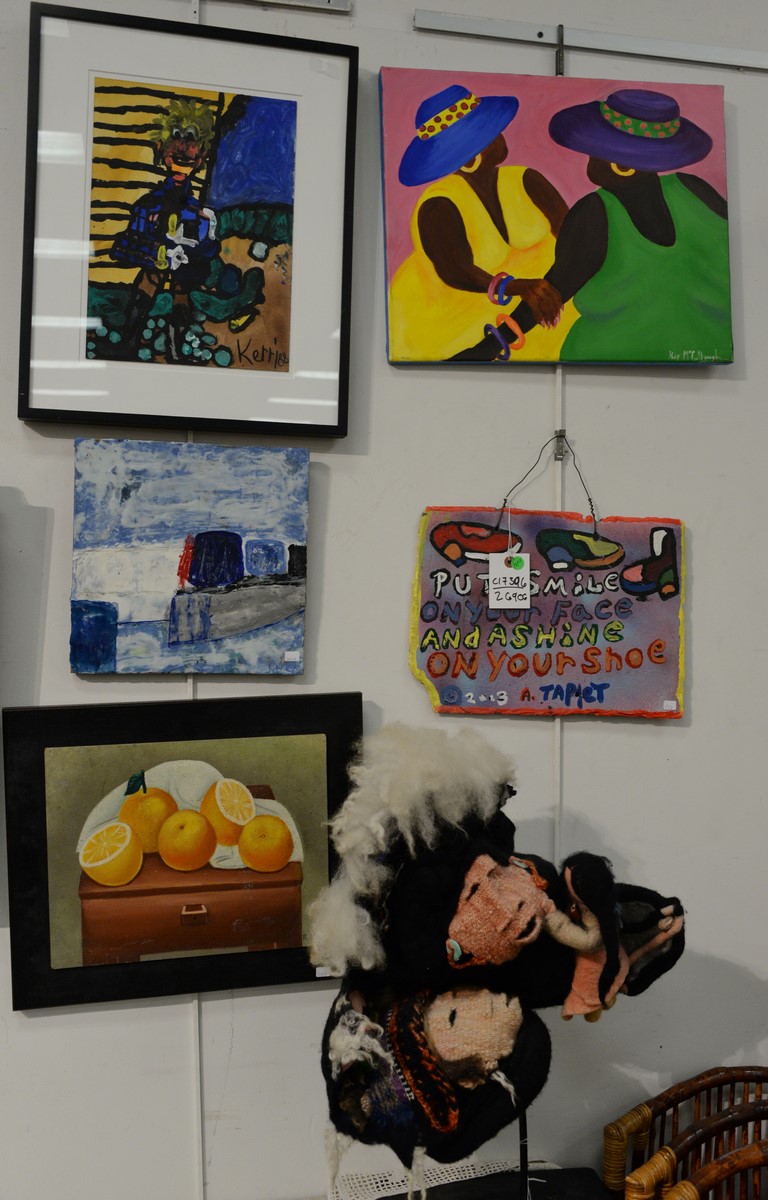 Group of six items to include Kerri Quirk painting, R. Paol still life of fruit, Kathleen McMahon wax, Kip McCullough oil on canvas, painting on slate, and woven sculpture. sculpture: ht. 23 in., paintings: 12 x 12 to 16 x 20