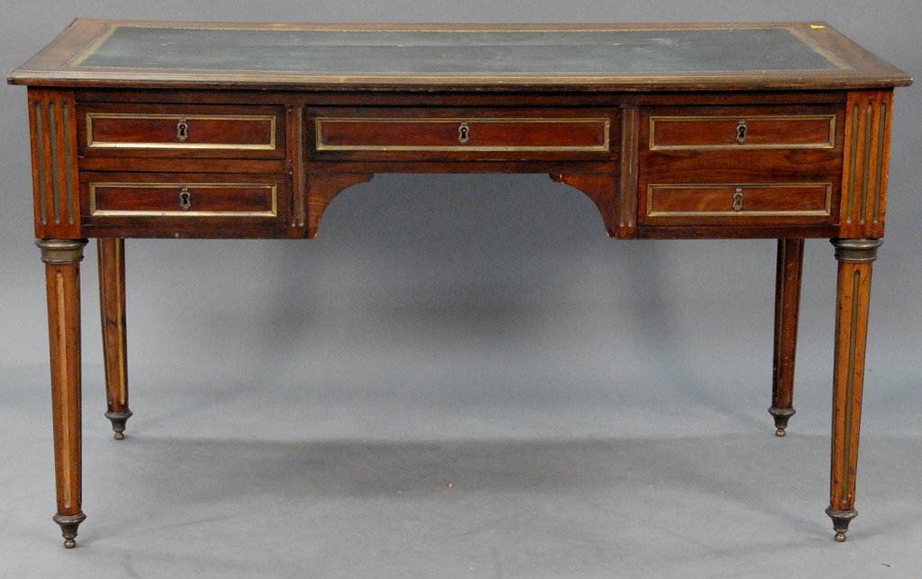 Lot 420: Louis XIV style mahogany bureau plat with rectangular tooled leather top with brass mount and two pull out slide also with tooled le…