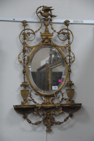 Page load linkLot 420: Federal style mirror, oval with eagle top, urns, and shelves, wood and gesso minor imperfections. ht. 35in.