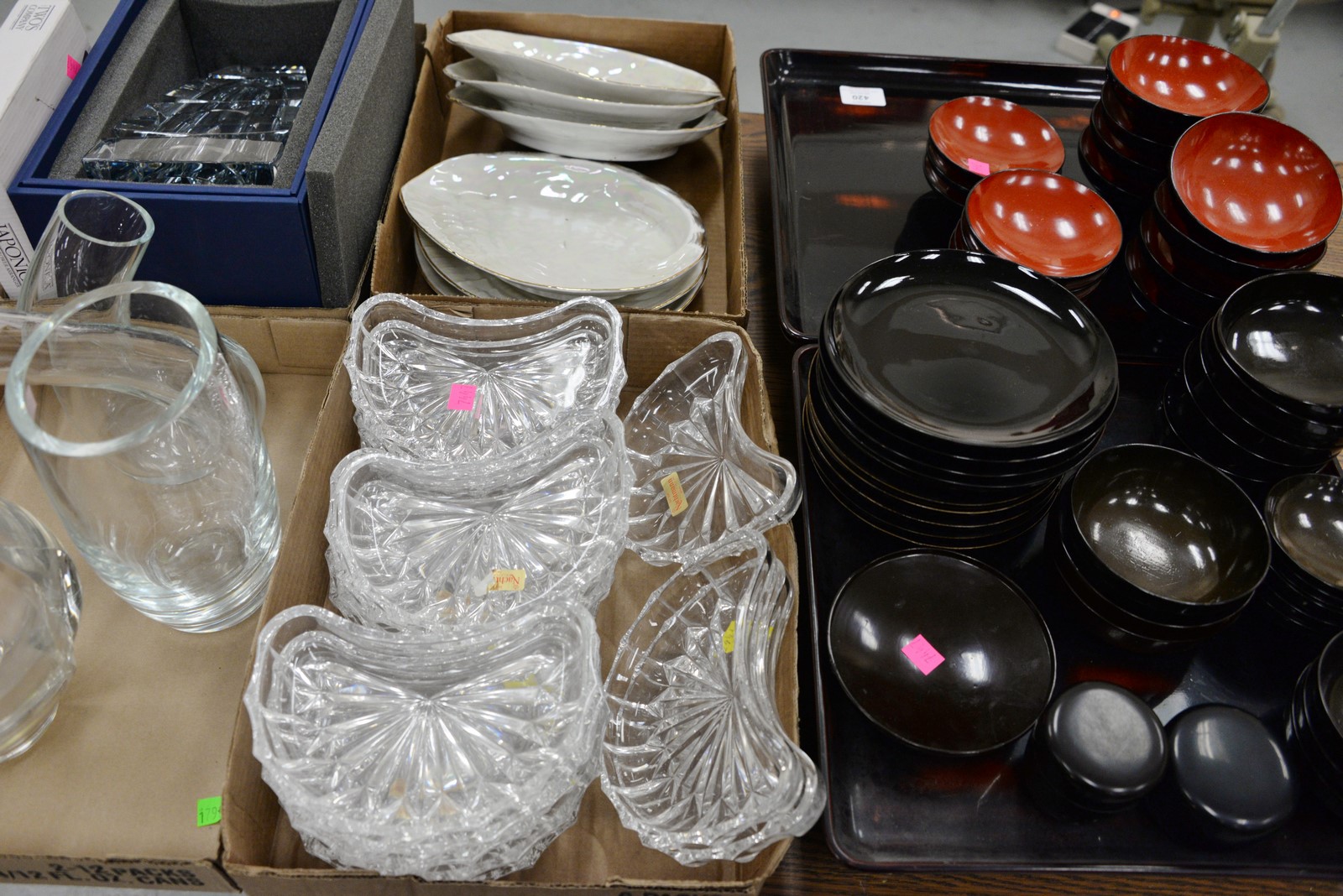 Large lot of Japanese lacquer bowls, plates, trays, box, crystal, dishes, and vases.