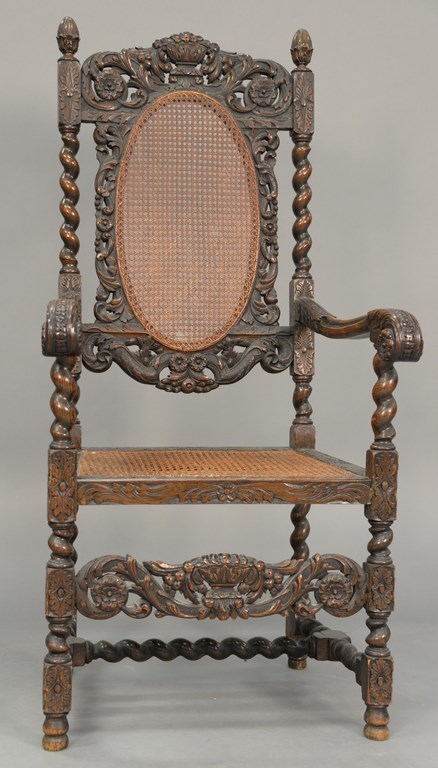 Lot 420: Carved oak armchair caning in seat split at edge.