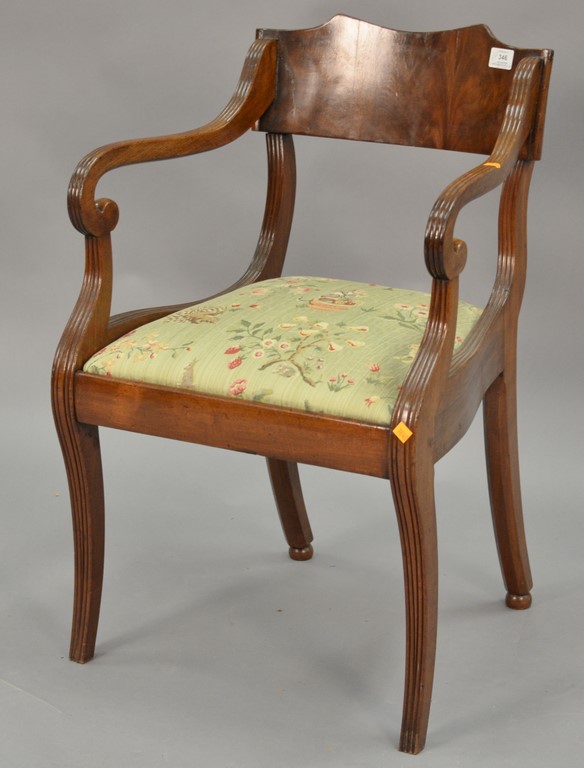 Lot 420: Mahogany amrchair with sabre legs and custom upholstered seat.