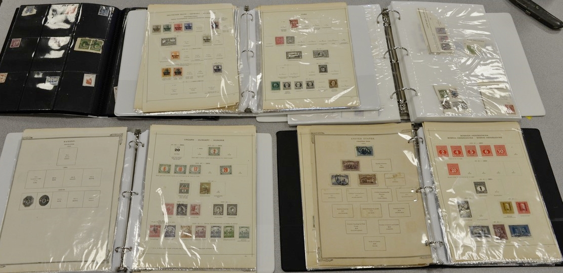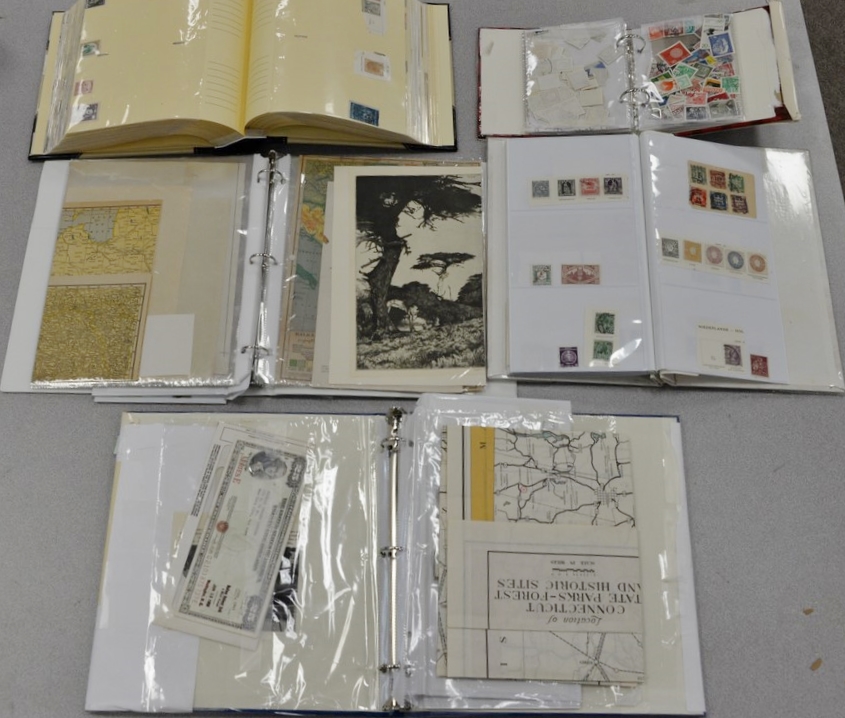 Lot 419B: Five piece lot to include three binders of mostly international stamps and two binders with miscellaneous maps, etchings, etc.