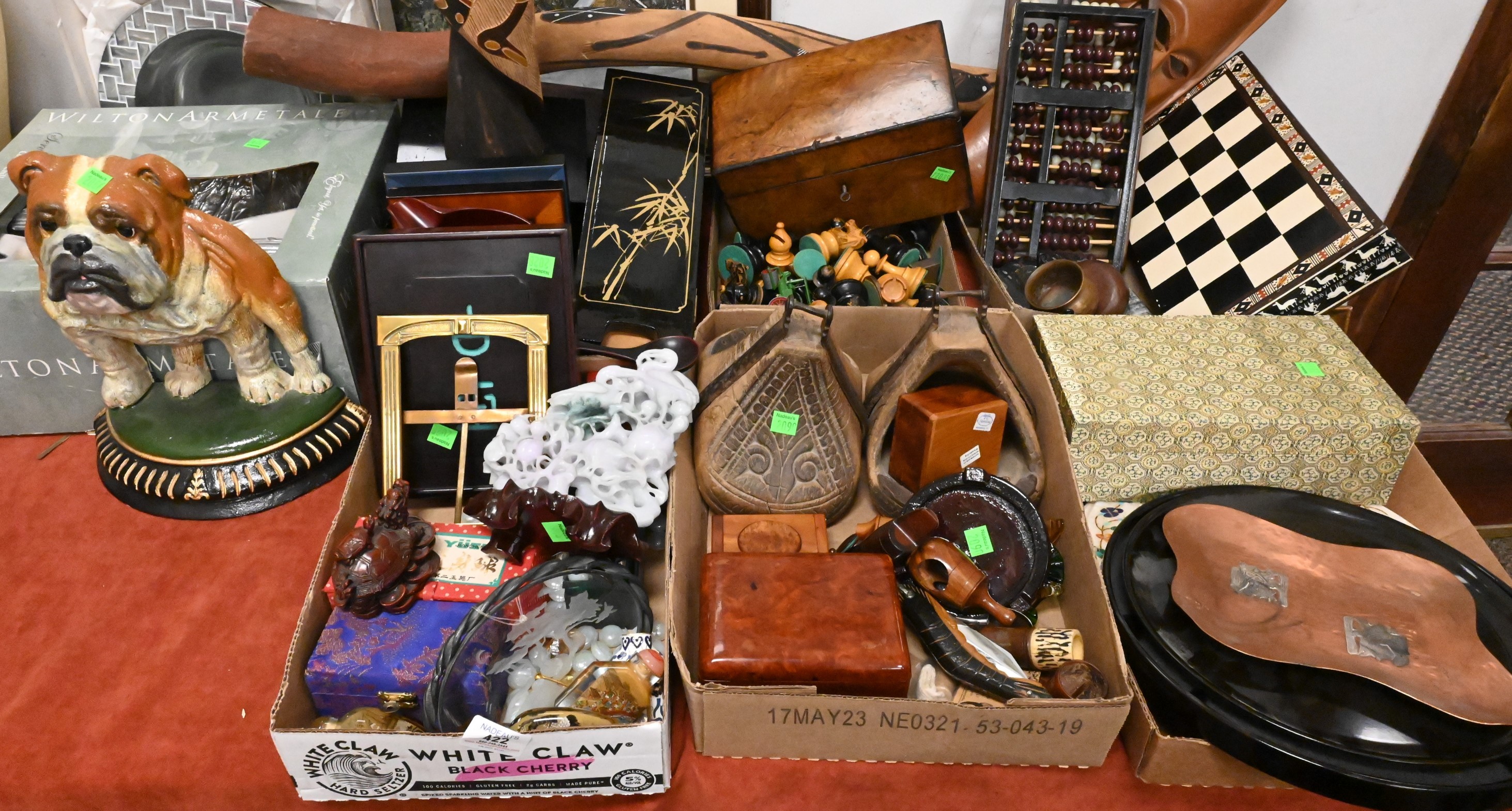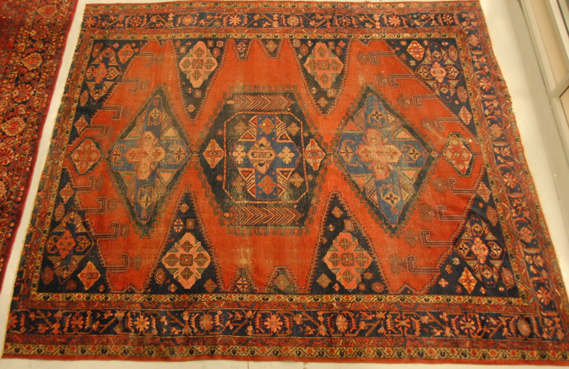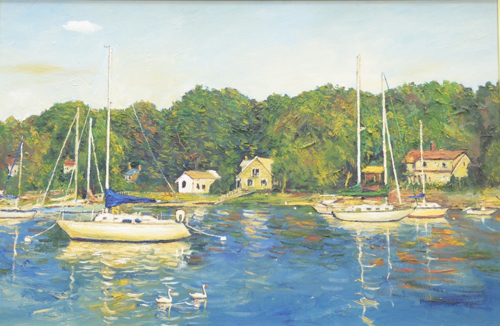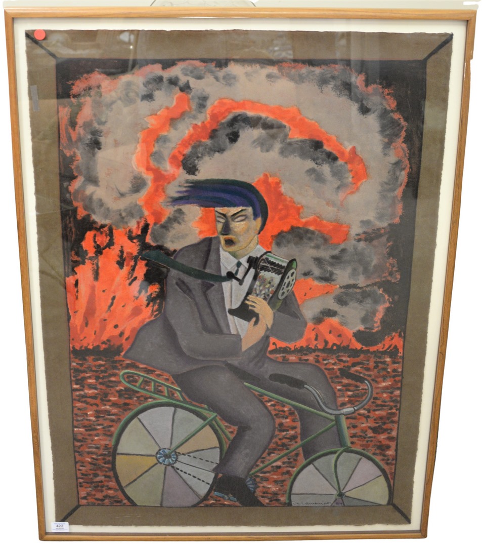 Four Piece Lot of Abstract Art, to include an abstract cityscape, oil on board, signed indistinctly lower right; yellow geometric abstraction, oil on canvas laid on board, signed indistinctly lower right; pink flowers on a blue background, acrylic on canvas, unsigned; along with a large red abstract composition, acrylic on canvas, unsigned, largest 38 1/4″ x 44″.