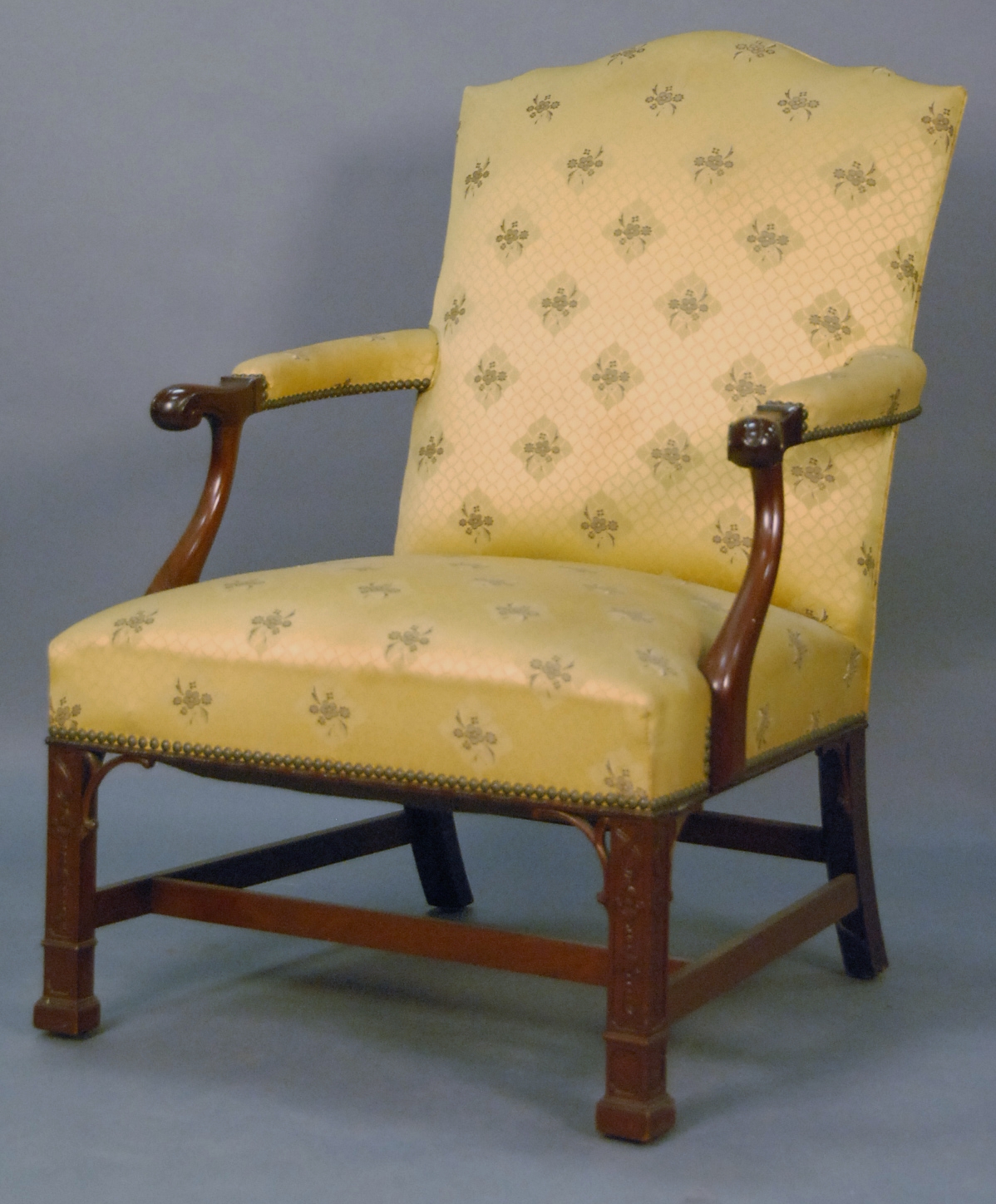 Lot 426: Margolis mahogany Chippendale style armchair with upholstered seat and back, on squared legs with carvings and stretcher base, attributed to Margolis shops.