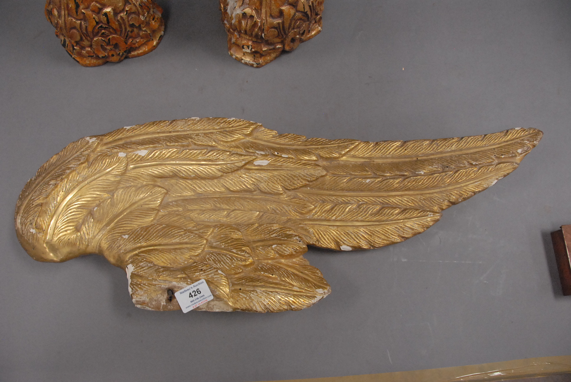Lot 426: Three piece lot to include Federal gilt eagle wing and pair of wood gessoed candlesticks chips.wing length 27 in.