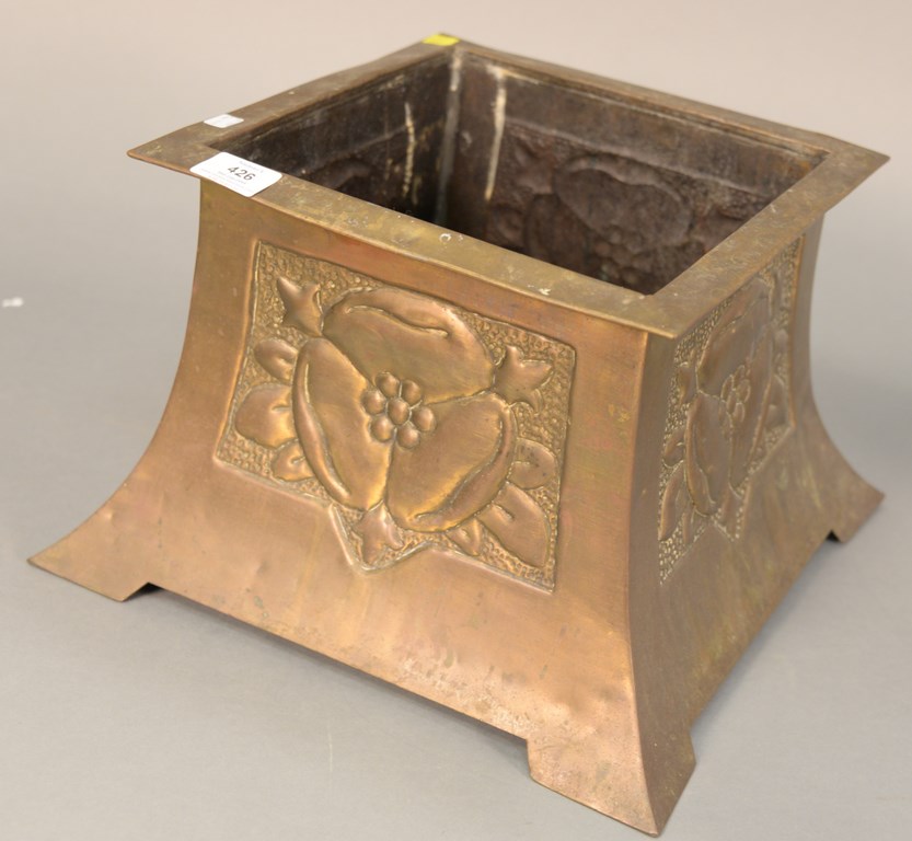 Lot 426: Mission style brass embossed planter. ht. 9 1/2 in. top: 12 x 12