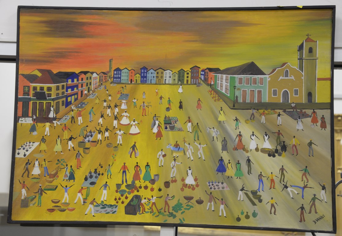 Lot 426: Two oil on canvas paintings including large South American courtyard signed D. Vanni and a winter landscape Kowalski. 28 x 41 and …