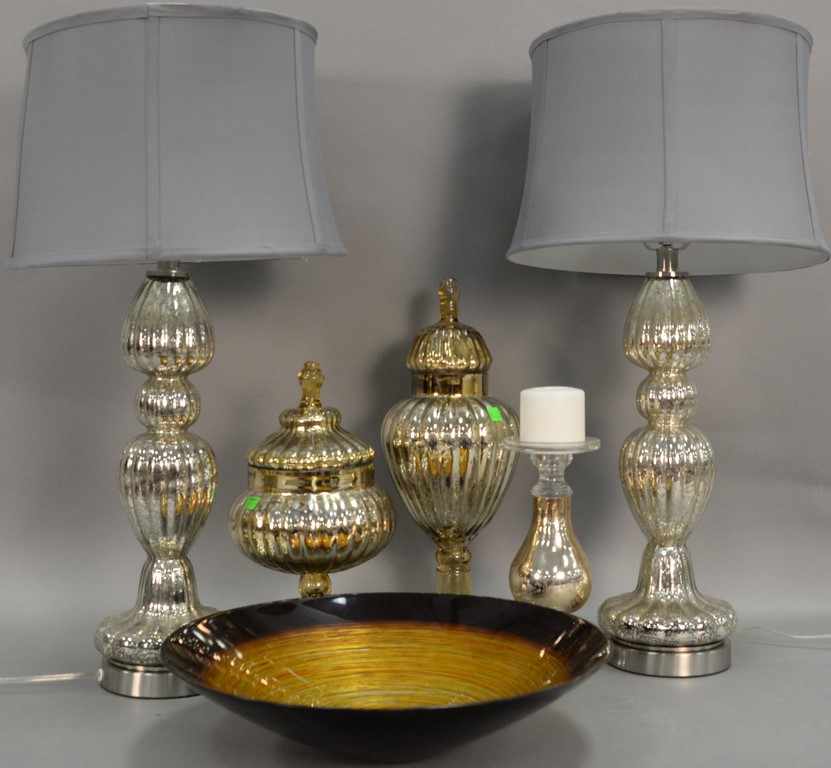 Six piece contemporary group including pair of mirrored lamps one as is, two pair of mirrored urns, candlestick, and an art glass center dish.